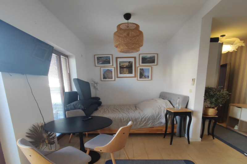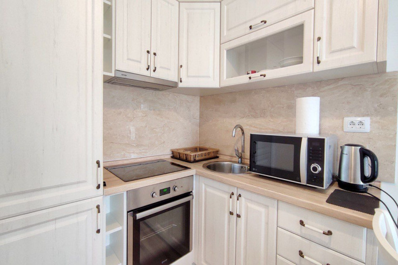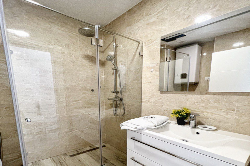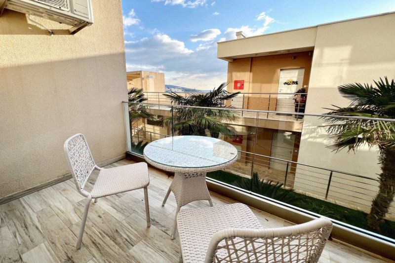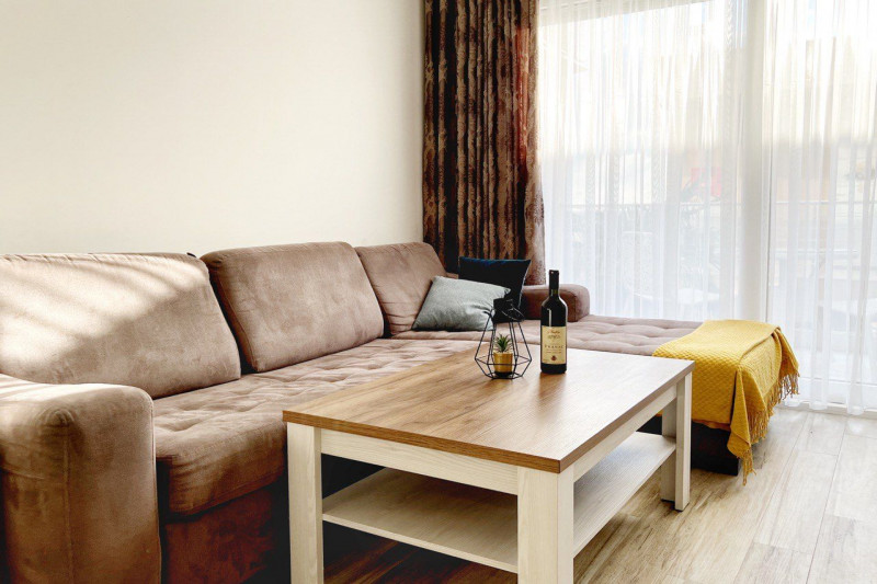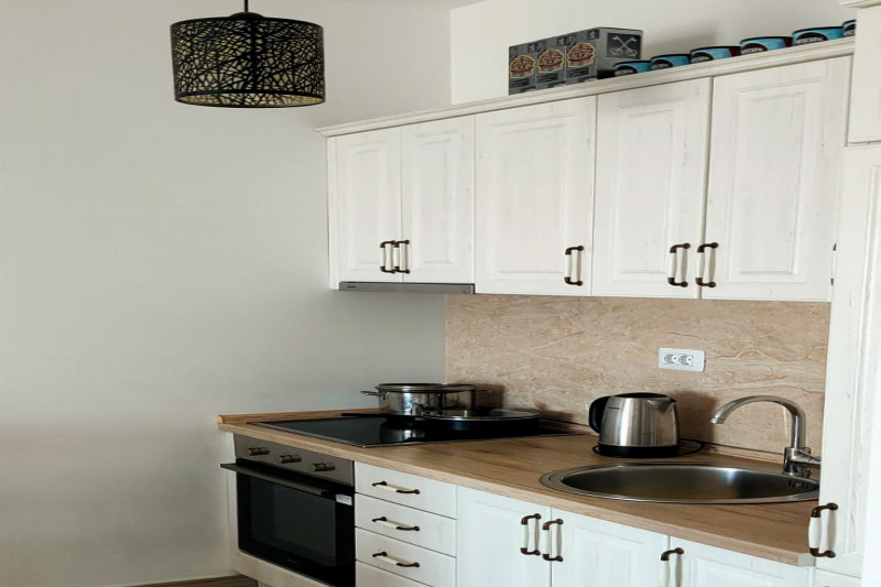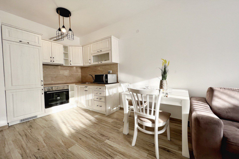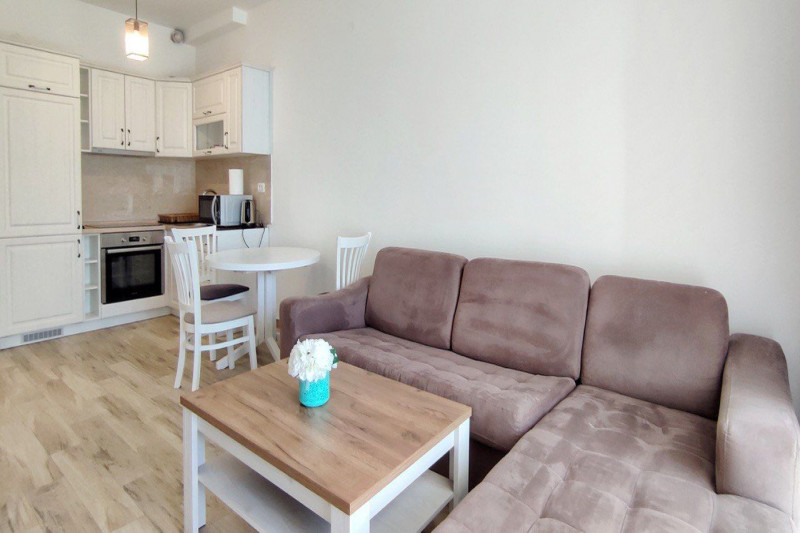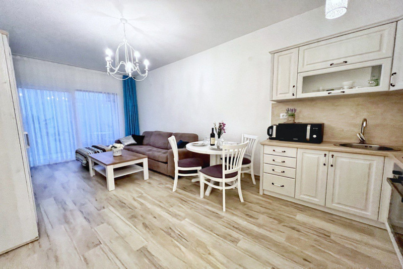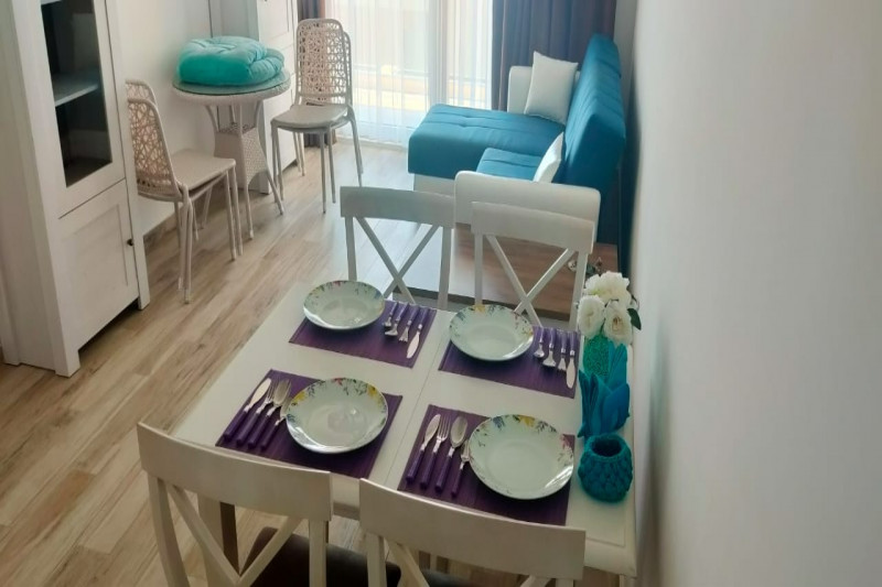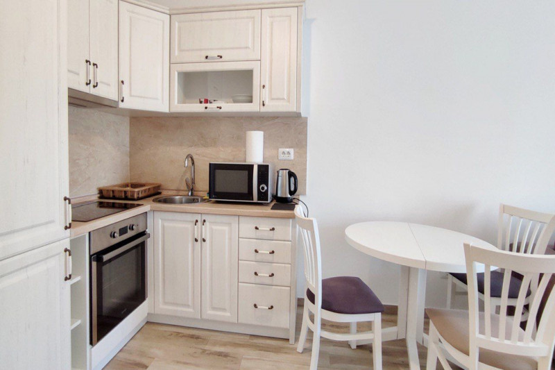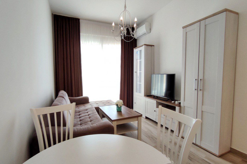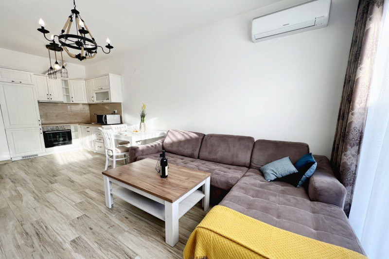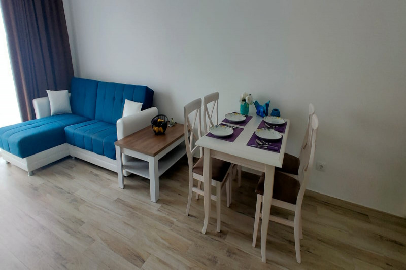 В квартире есть планировка из одной спальни, прихожей, кухни, ванной комнаты, гостиной и террасы. С террасы открывается прекрасный вид. Квартира полностью меблирована и имеет все необходимое для комфортного проживания.