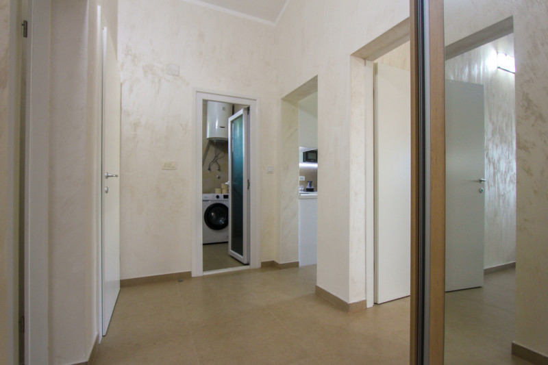 Планировка квартиры: большая прихожая, кухня совмещенная с гостиной и столовой, спальня, ванная комната и терраса с частичным видом на море и горы.