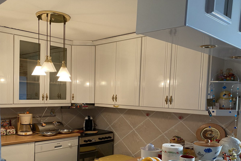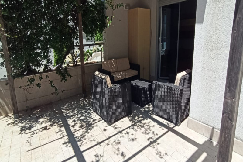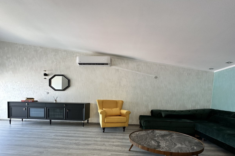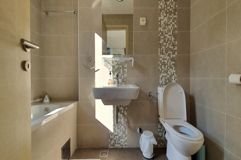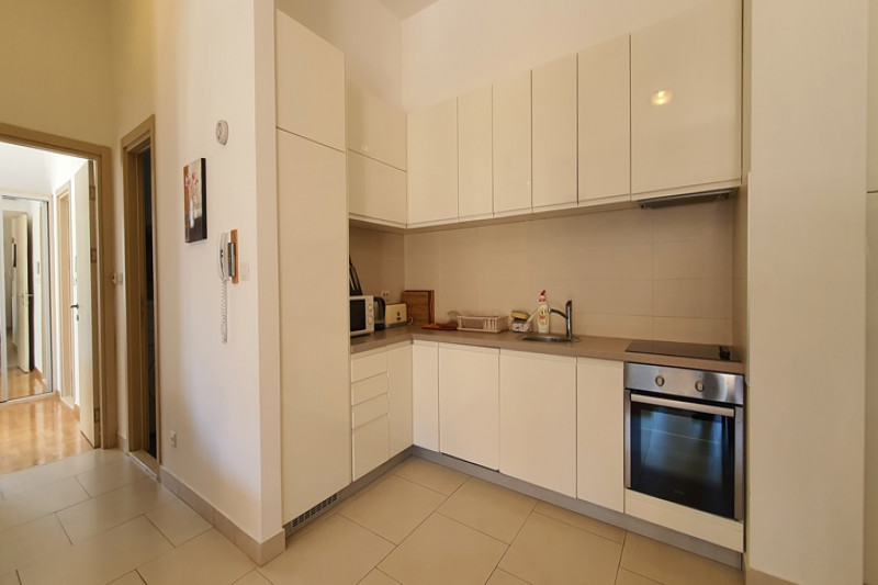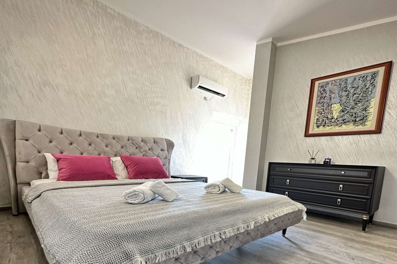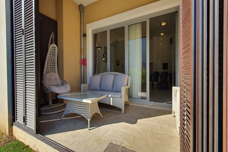 Площадь квартиры составляет 85м2. Планировка квартиры: две спальни, ванная комната, гостиная, совмещенная со столовой, отдельная кухня и терраса.