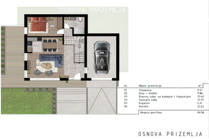 Цокольный этаж: гараж, резервуар для воды, техническое помещение и небольшая терраса.