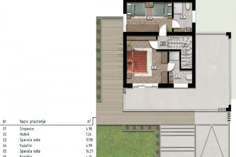 Второй этаж: мансарда с отдельной лестницей; большое помещение с балконом с видом на море, оборудованное под домашний офис.