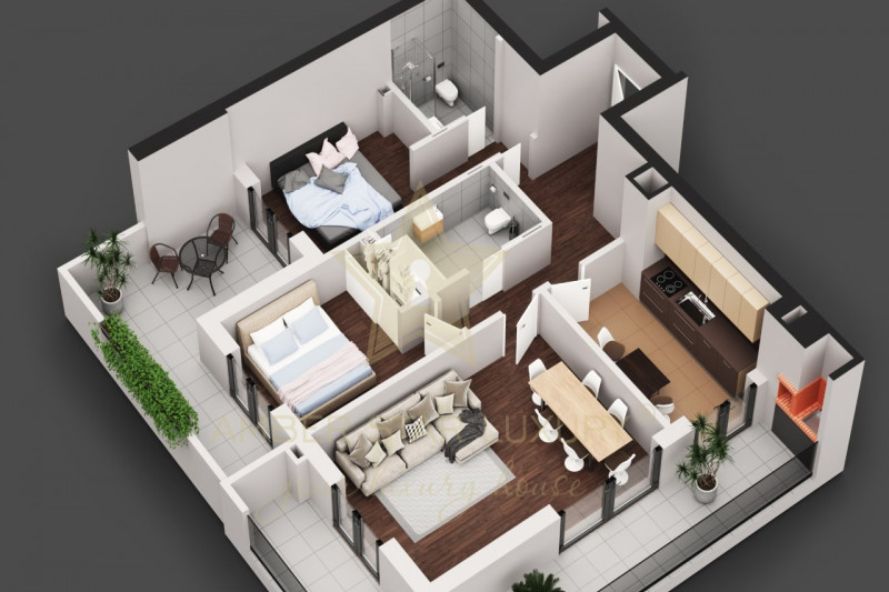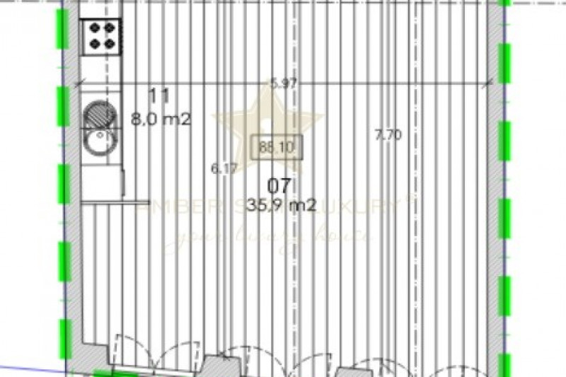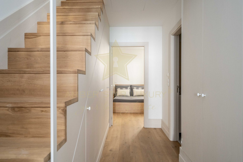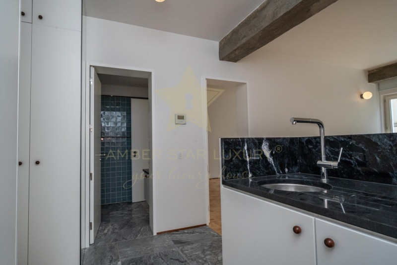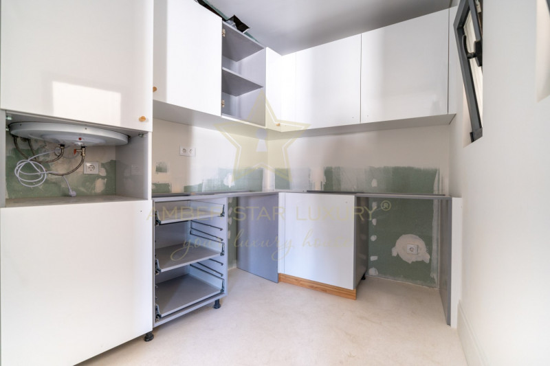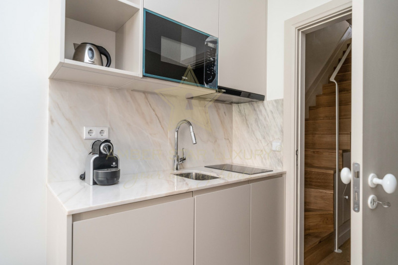 Квартира состоит из прихожей, полностью оборудованной мини-кухни с техникой Bosch, посудомоечной машиной, вытяжкой, плитой, микроволновой печью и духовкой (открытое пространство), гостиной/спальни, открытой столовой и 1 ванной комнаты.
