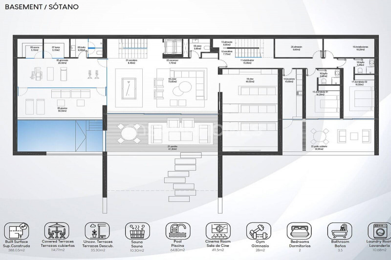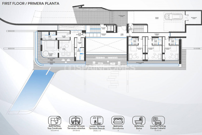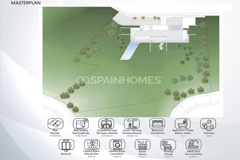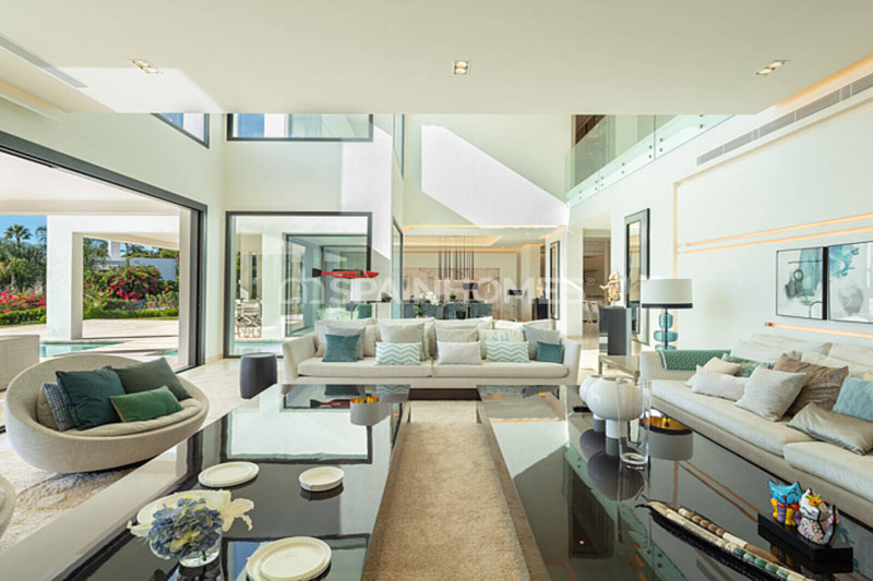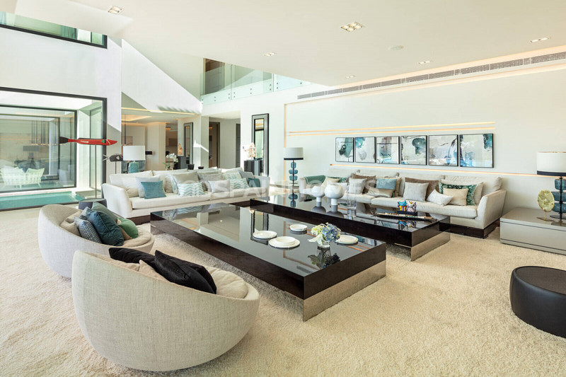 Изысканные гостиные, обеденные и развлекательные зоны соединены с крытыми и солнечными террасами площадью 700 м². Этот экодом с системами энергосбережения оснащен системой «умный дом», теплыми полами, кондиционером, лифтом, окнами с двойными стеклопакетами, встроенными шкафами, гардеробной, джакузи, сауной, тренажерным залом, гаражом на 4 машины и 4 открытыми парковочными местами.