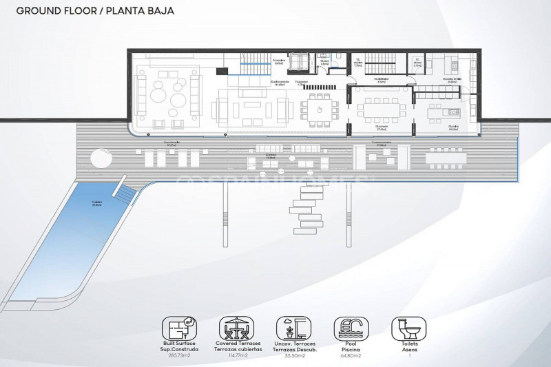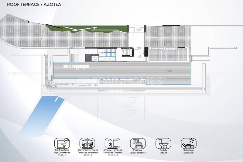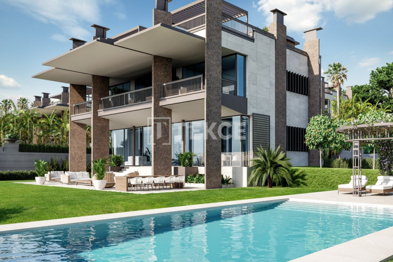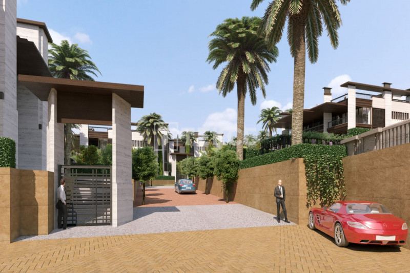 Первоклассный дом построен на крупном участке площадью 2000 м² в жилом комплексе. Придомовая территория включает в себя ухоженный сад, открытые лаундж-зоны, солярий, площадки для отдыха и обеденные зоны под открытым небом, где можно приятно провести время, наслаждаясь сенсационными средиземноморскими закатами. Одной из изюминок дома является потрясающий бассейн-инфинити со струйным водопадом.