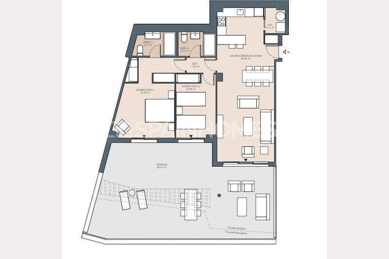 Апартаменты состоят из спален, просторной гостиной, полностью оборудованной кухни и ванных комнат. Дом оснащен системой теплых полов, системой кондиционирования с холодным воздухом, гаражом и кладовой.