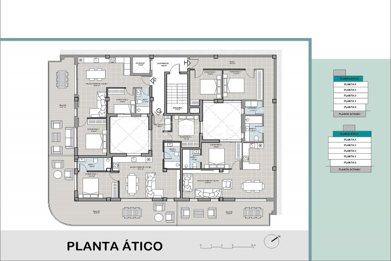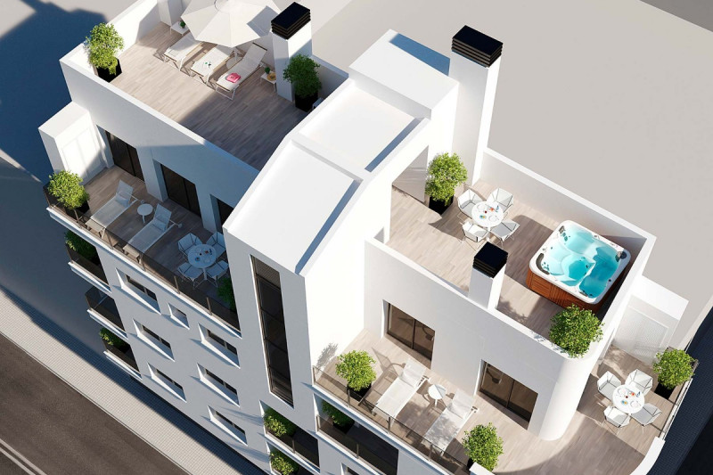 Здание состоит из 17 квартир, расположенных на первом этаже, промежуточных этажах и пентхаусах, все с террасами. Кроме того, в одном из пентхаусов есть собственный солярий, где можно позагорать или насладиться трапезой в лучшей компании. Дома имеют двойное остекление, что обеспечивает высокую степень тепло-акустической изоляции. Кухня полностью меблирована, в ванных комнатах полы с подогревом. Он также включает в себя красивую общую террасу на крыше с бассейном и солярием.