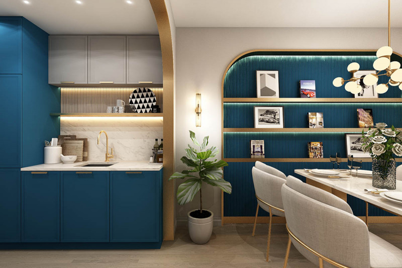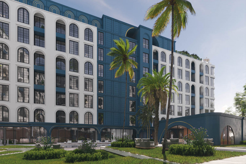 В апартаментах: В здании 5 этажей, где расположены 124 квартиры (по 31 на этаж), выполненные в двух вариантах планировки — студии «Универсал» на 36 м² и апартаменты «Делюкс» с одной спальней на 55-61 м². Независимо от размеров, отделка всех квартир также в духе современного круизного лайнера, с акцентом на комфорт. Все апартаменты отличаются обилием натурального освещения, объемом открытых пространств и естественно изогнутыми плавными линиями. Более того, каждая из 124 квартир располагает собственным балконом.