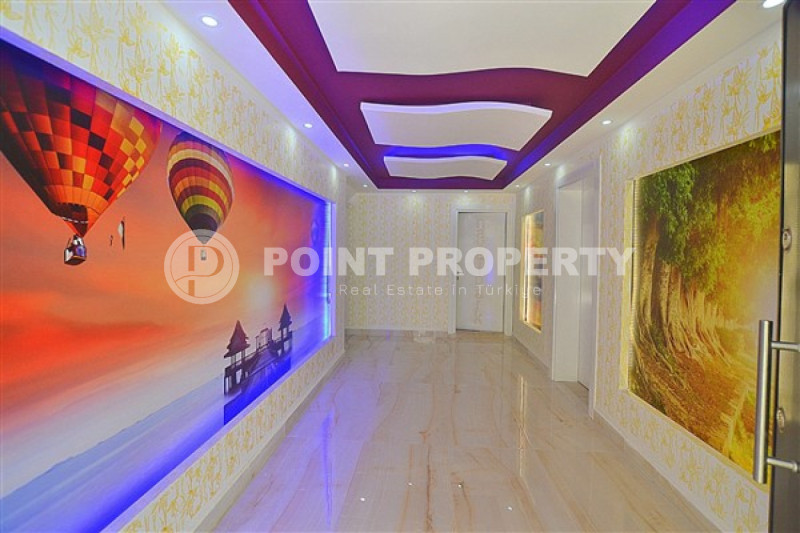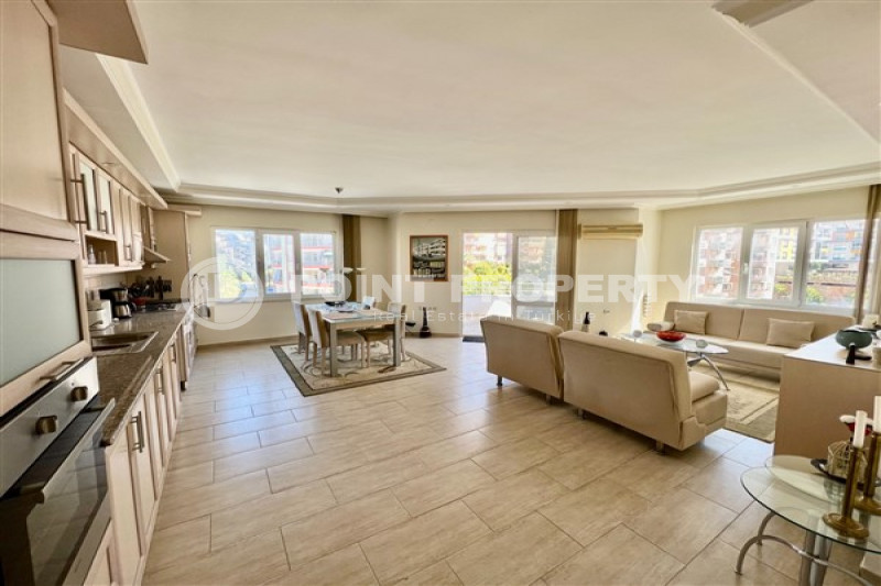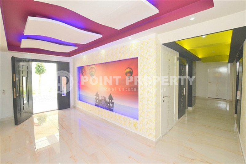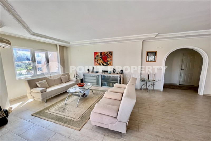 Если вам по душе спокойная размеренная жизнь в экологически чистой части Аланьи, советуем обратить внимание на апартаменты в районе Тюрклер. Портфолио компании 1-Property пополнила просторная двухуровневая квартира 3+1, общей площадью 175 м², на 7-м этаже с мансардой. В современной планировке апартаментов - большая совмещенная с кухней гостиная, разделенная на обеденную зону и салон, три спальни, три оснащенных душевыми кабинами санузла, два панорамных балкона и две просторные видовые террасы. Квартира легкая и атмосферная и выдержана в едином стиле. Преобладание светлых оттенков в интерьере визуально делают комнаты еще более просторными, теплое потолочное освещение и классический кухонный уголок цвета дерева создают ощущение уюта, а яркие акценты в виде мягкой мебели, предметов декора и ковров придают апартаментам лоск и стиль. Дуплекс полностью готов к проживанию - в гостиной имеются комфортабельные мягкие диваны и кресла, обеденный стол и стильный гарнитур, спальни укомплектованы кроватями и вместительными гардеробными шкафами, кухня оснащена по последнему слову техники, а на балконах и террасах организованы роскошные зоны отдыха с шезлонгами для загара и удобной садовой мебелью.