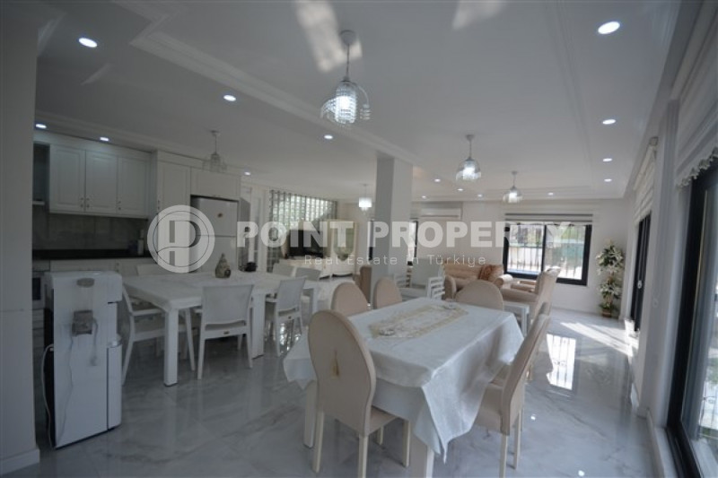 Планировка виллы 5+1 — это значит, что здесь на трёх этажах размещаются пять спален, два санузла, 2 балкона и выход на террасу на крыше. На террасе установлена ванна-джакузи. На первом этаже расположена большая гостиная, в которой можно выделить зону столовой, зону отдыха с телевизором и камином, и у панорамного окна — место для любования природой и морем.