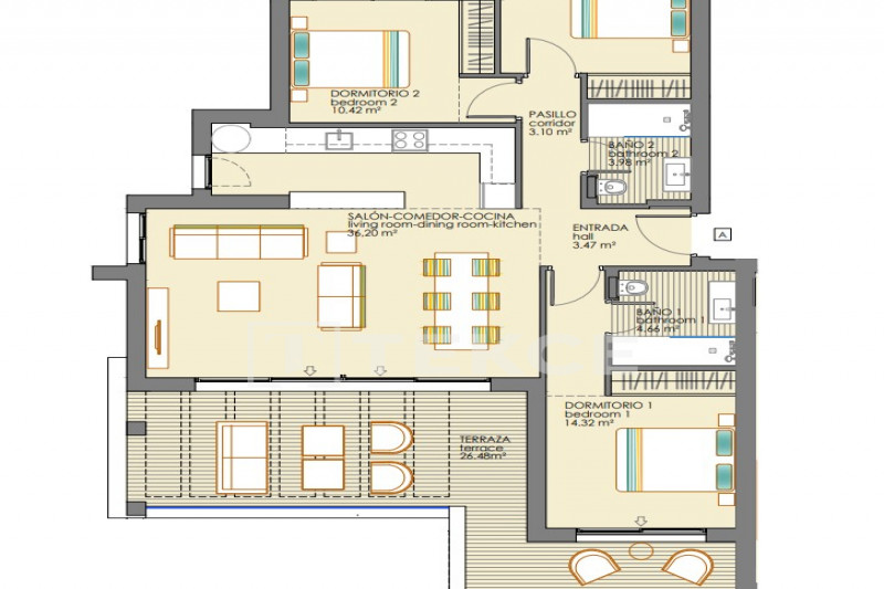 In this project the international developer offers a choice of contemporary homes with open plan interiors that will feature high quality finishes and use of premium materials in construction. These bright properties boast generous terraces perfectly blended with the indoor areas through the use of extra large floor-to-ceiling windows to make the most of the natural light and enhance the views. The homes will be delivered with fitted and equipped kitchens, a/c throughout and a basic automation system.
