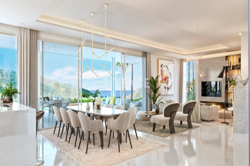 On the ground floor, there is a generous space that can be transformed into a guest room, a cinema, a gym, etc. On the first floor, there is a garage with a capacity of 4 vehicles, 4 spacious bedrooms with en-suite bathrooms including a master bedroom, with a walk-in wardrobe, a generous bathroom with a bathtub, and access to a private terrace. On the second floor, there is an extensive communal space that consists of a living room, a dining area, and a semi-separated kitchen with sea views. Every corner opens to the pool terrace through wide windows.