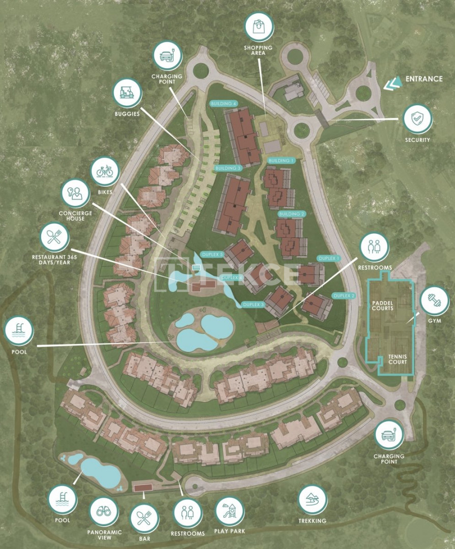 The flats are situated in a complex with an urban resort concept. The complex has a private entrance with 24/7 security and CCTV. The complex also has swimming pools including a main pool heated with solar energy and an infinity pool, 2600 sqm of sports area with fitness, padel school, and tennis, a kids’ playground with zip line, swings, and table tennis, a restaurant, tropical gardens, and concierge service.