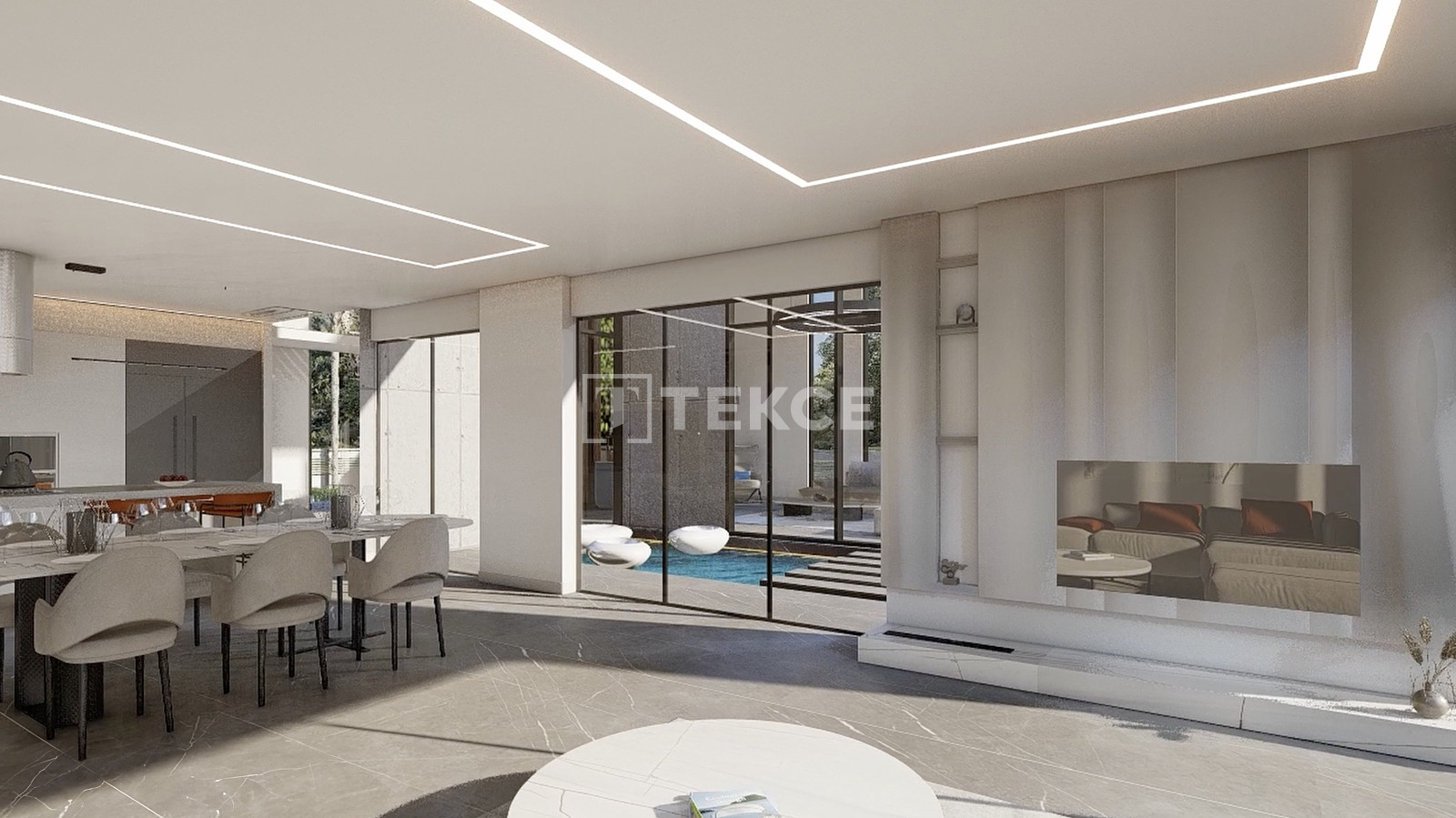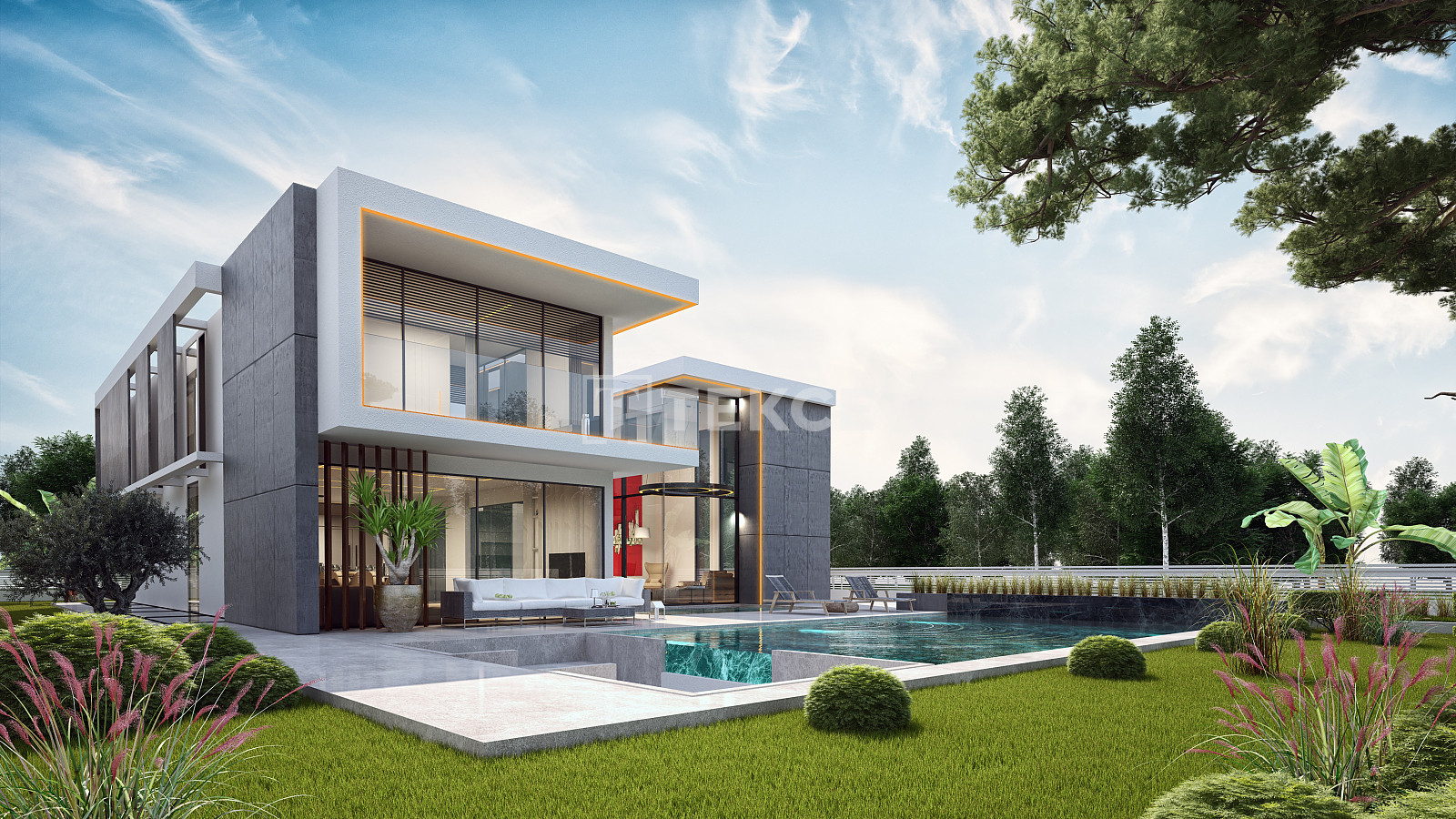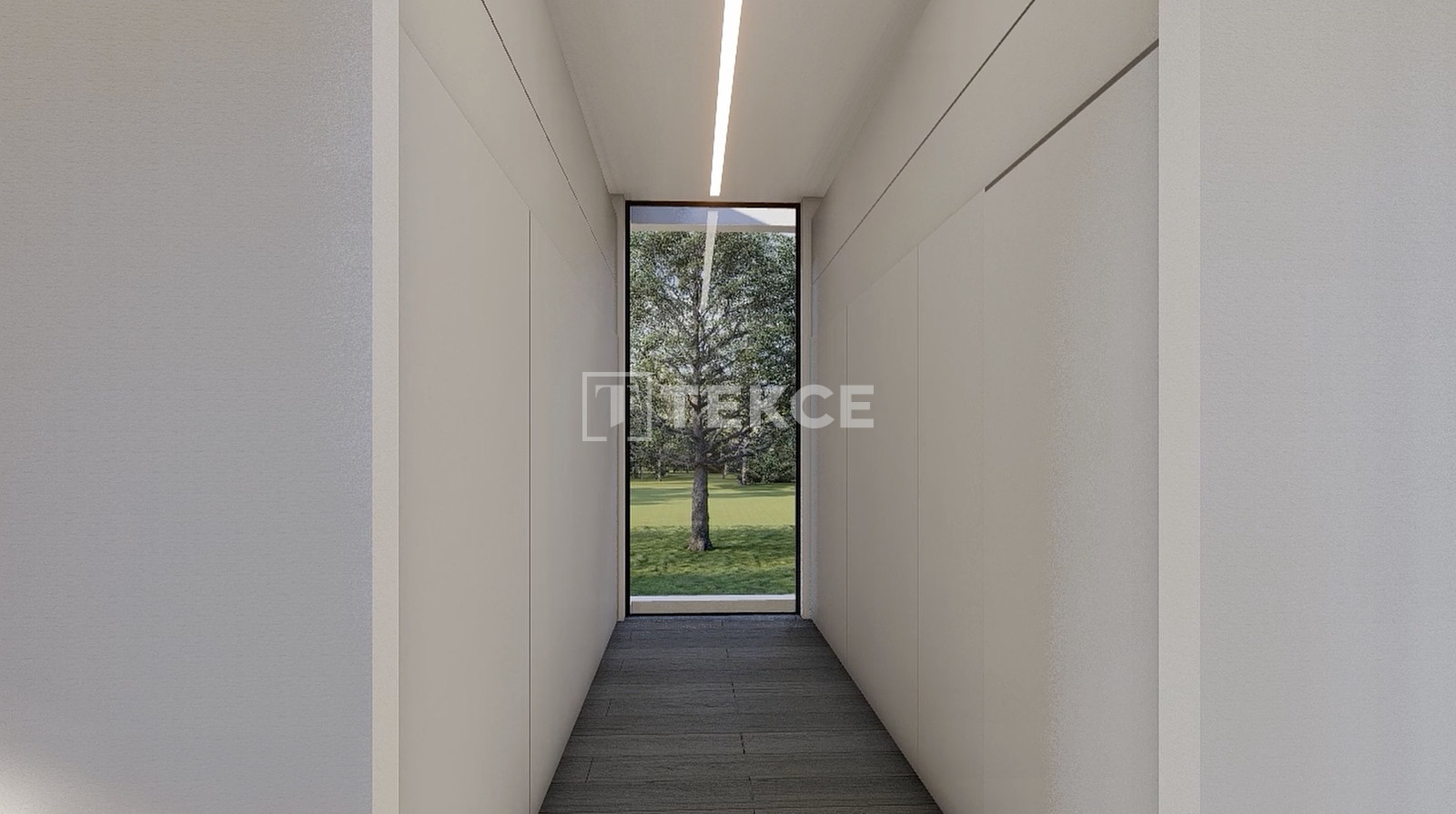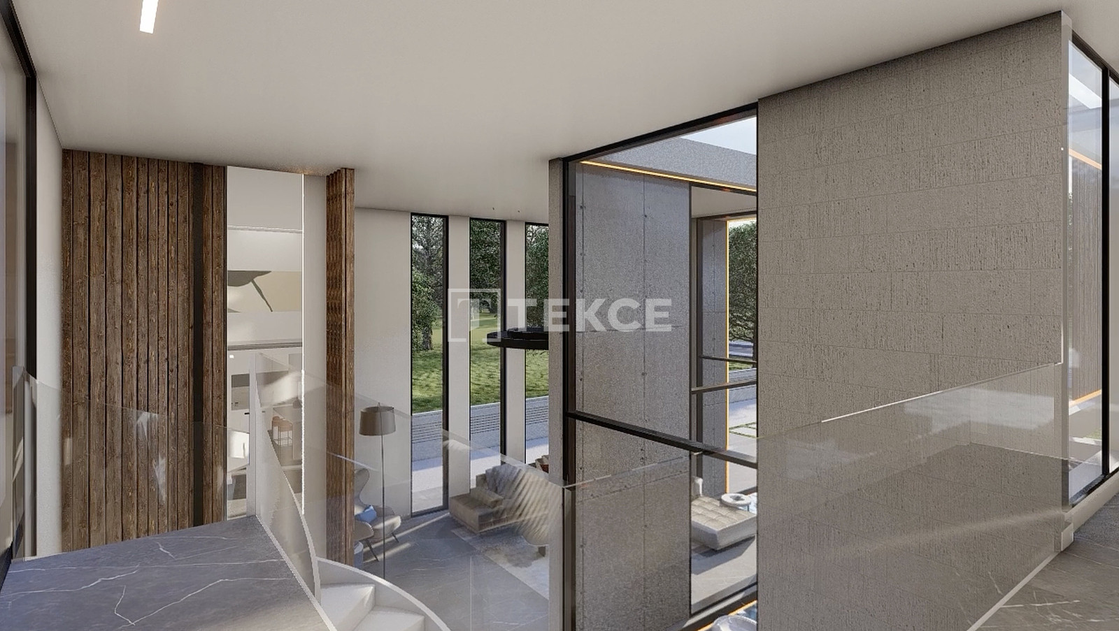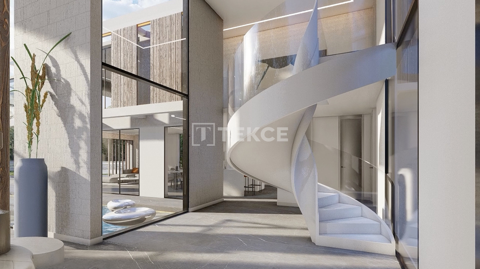 The villa is equipped with a smart home system, underfloor heating, and a VRF cooling system. It features high-quality materials, including the armature, aluminum windows, wooden surfaces, ceramic surfaces, lacquer interior doors, lacquered kitchen cabinets, and electrical blinds.