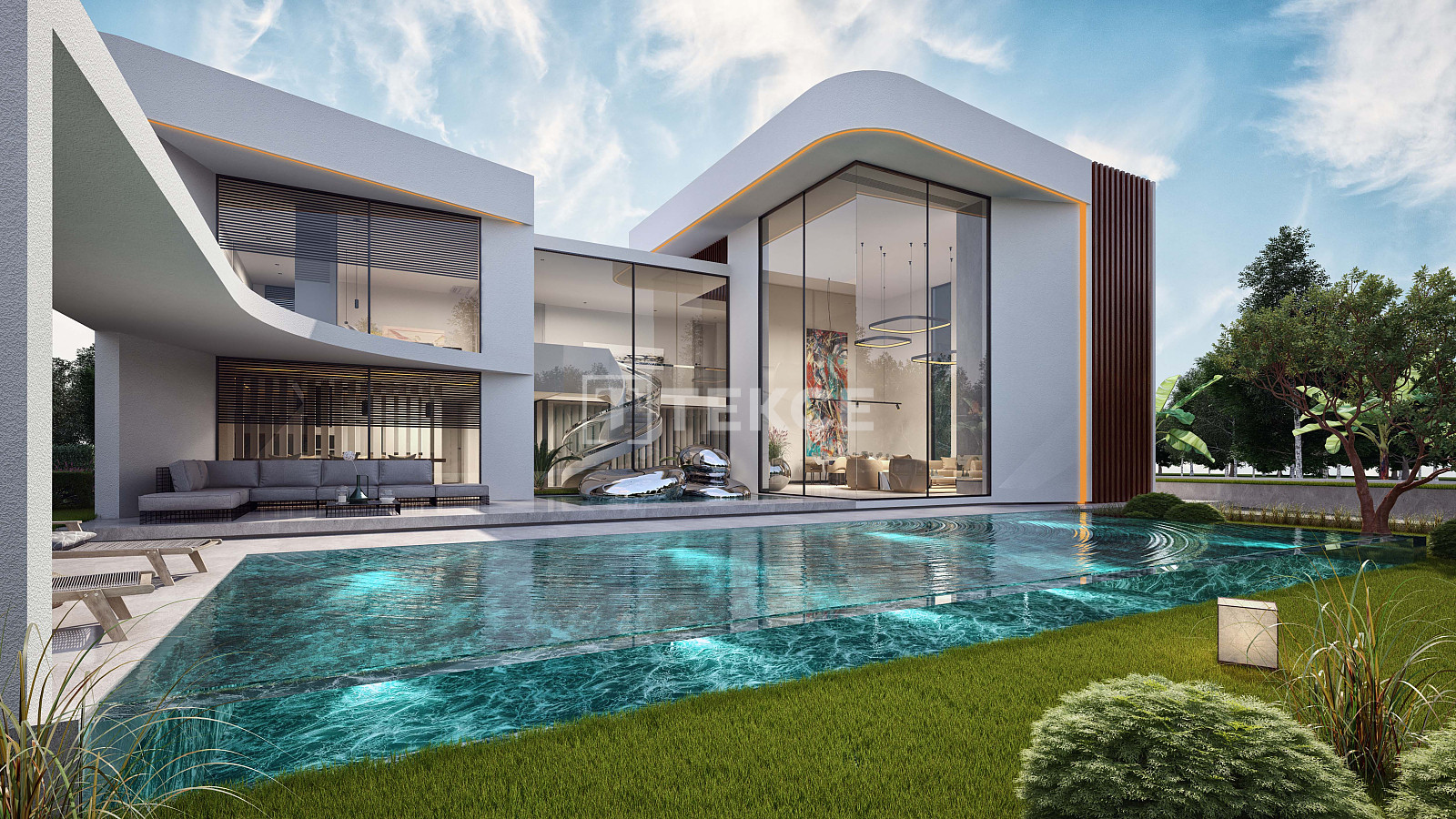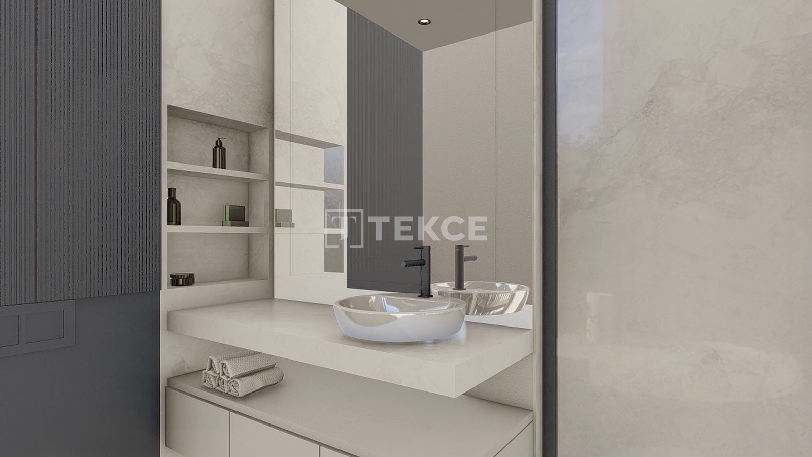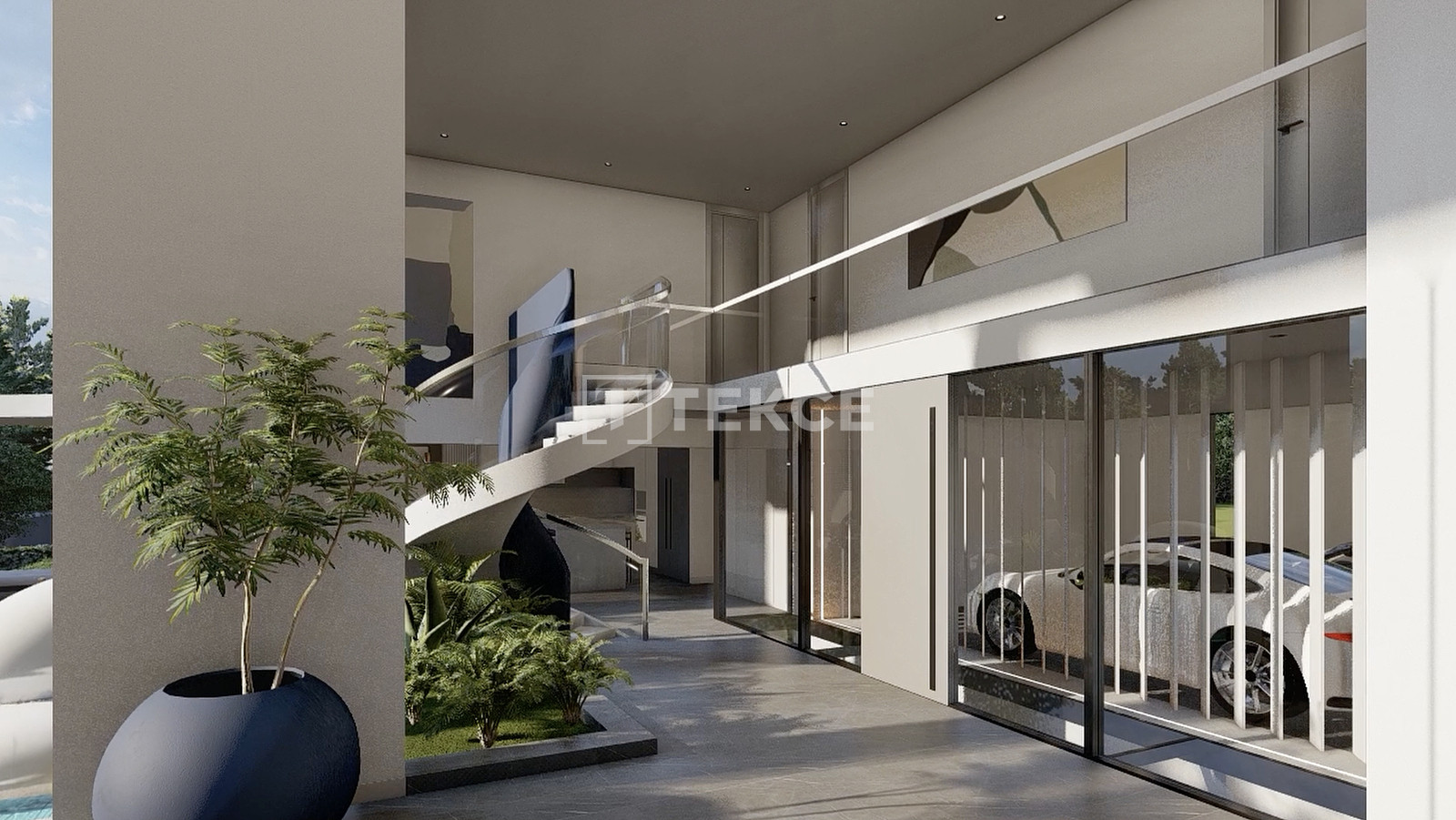 The villa includes bedrooms, en-suite bathrooms, 2 spacious living rooms, an open-plan kitchen, laundry room, cellar, annex, fitness area, cinema area, sauna, Turkish bath, and steam room. It is equipped with a smart home, underfloor heating, and VRF cooling systems. In addition, the villa features high-quality armatures, wooden and ceramic surfaces, lacquer interior doors and kitchen cabinets, electrical blinds, and a ceiling-high steel exterior door.