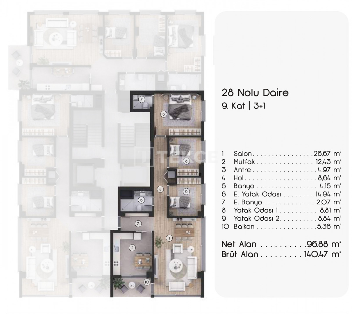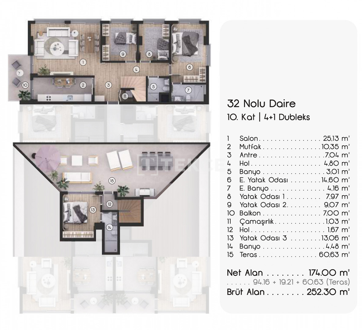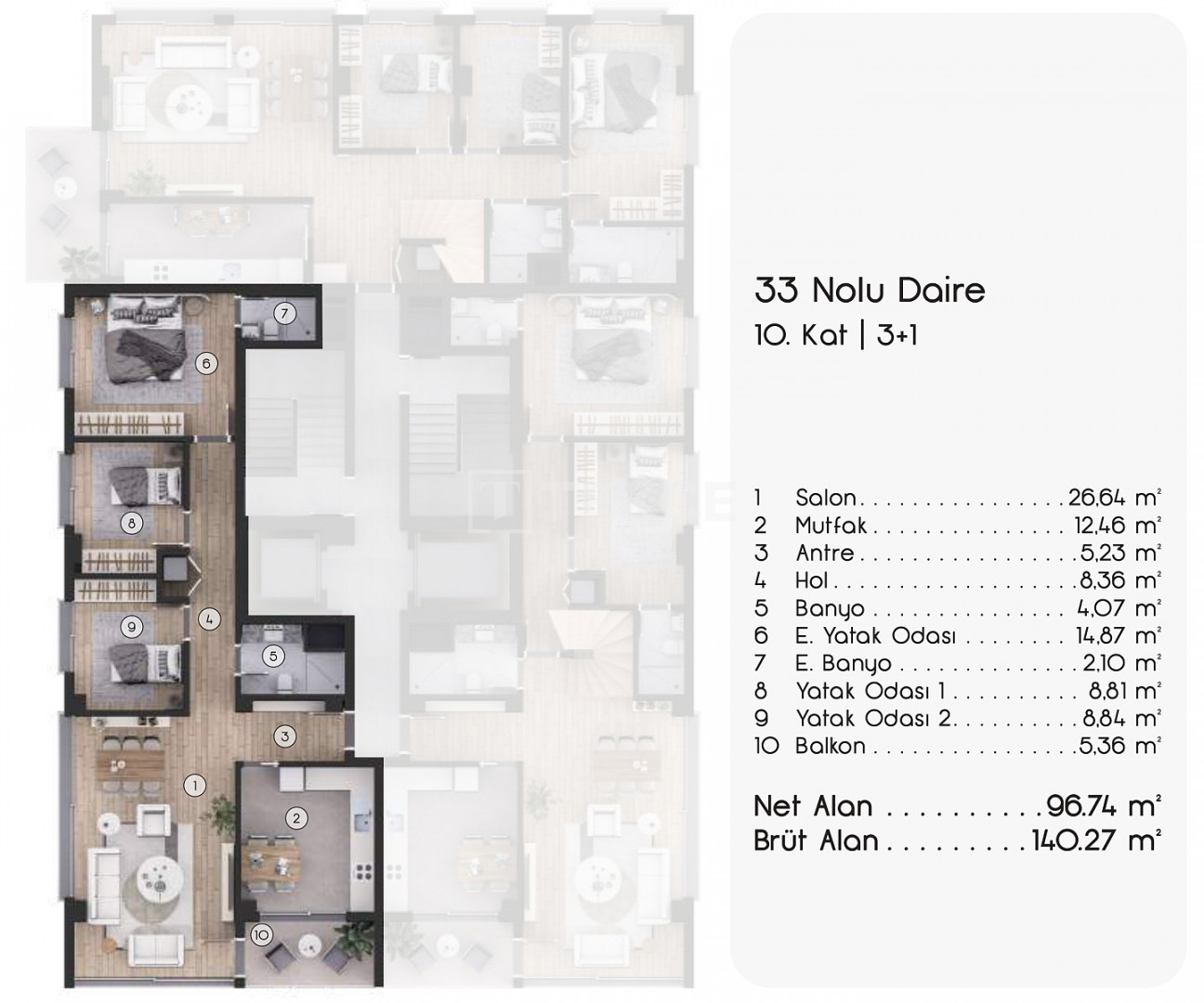 The apartments are in a single-block project consisting of 33 apartments with 10 floors built on 900 sqm of land. The project has a mezzanine and roof duplex apartments with en-suite bathrooms and laundry rooms. There are rich facilities such as lacquered kitchen cabinets, quality branded armatures, electronic blinds, aluminum window systems, air conditioning, wooden and ceramic floor coverings, and underfloor heating systems.