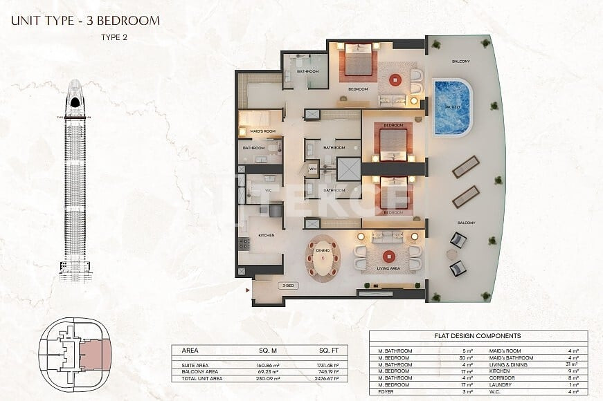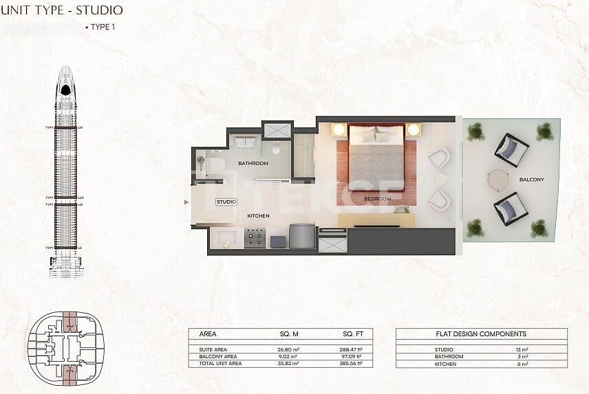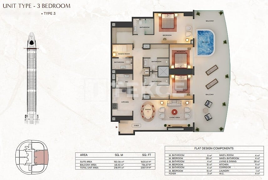 Offered by TEKCE, the project includes a wide range of property types, from studios to spacious three-bedroom units. Some exclusive residences also feature private pools, jacuzzis, and maids’ rooms, adding an extra touch of luxury. The development is designed with resort-style amenities, including a rooftop infinity pool, spa and wellness areas, a fully equipped gym, landscaped terraces and gardens, jogging and walking tracks, children’s play areas, retail and dining outlets, 24/7 concierge and valet services, security, and secure indoor parking. Owning a unit in such a prestigious and central location offers a lifestyle of convenience, luxury, and long-term value.