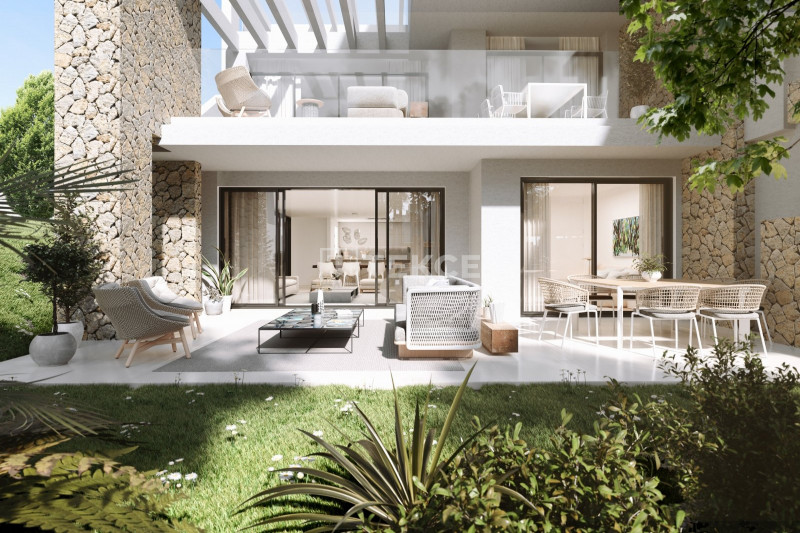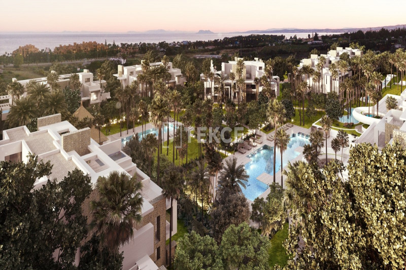 Проект спроектирован с учетом средиземноморского климата и включает просторный общий сад, большой бассейн и уютные зоны отдыха на открытом воздухе. Зеленые насаждения, удобные места для отдыха и прямые дорожки к пляжу создают атмосферу курорта.