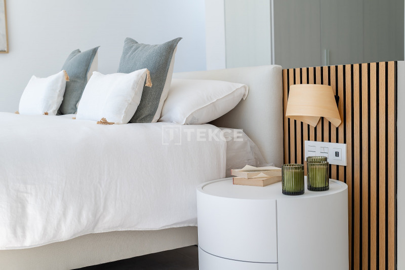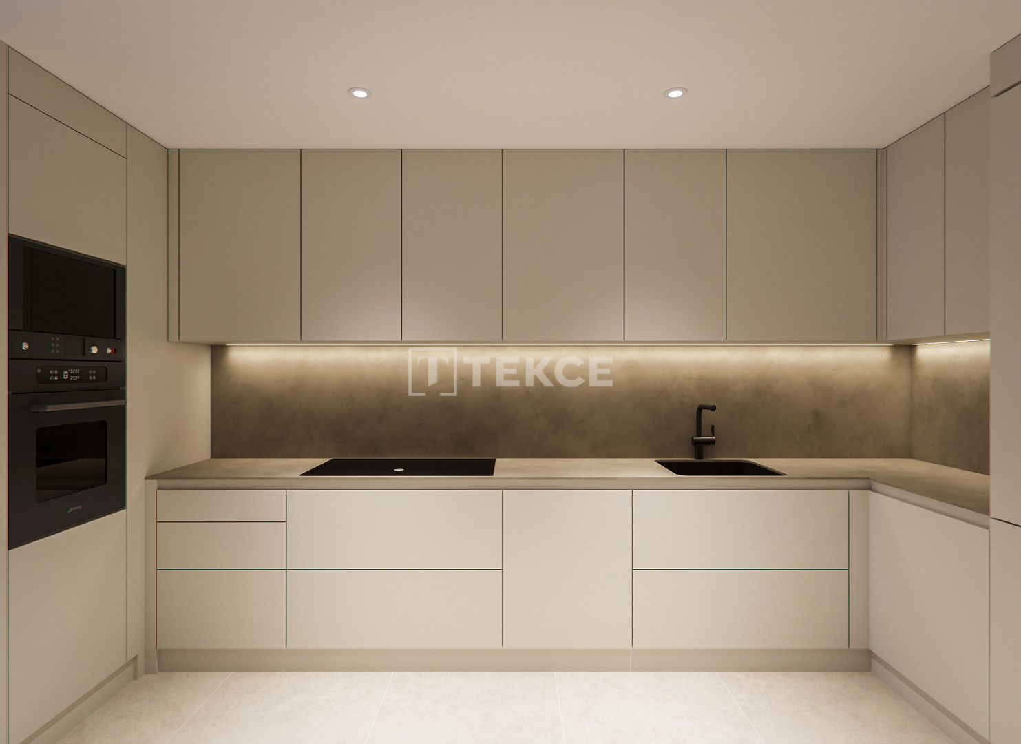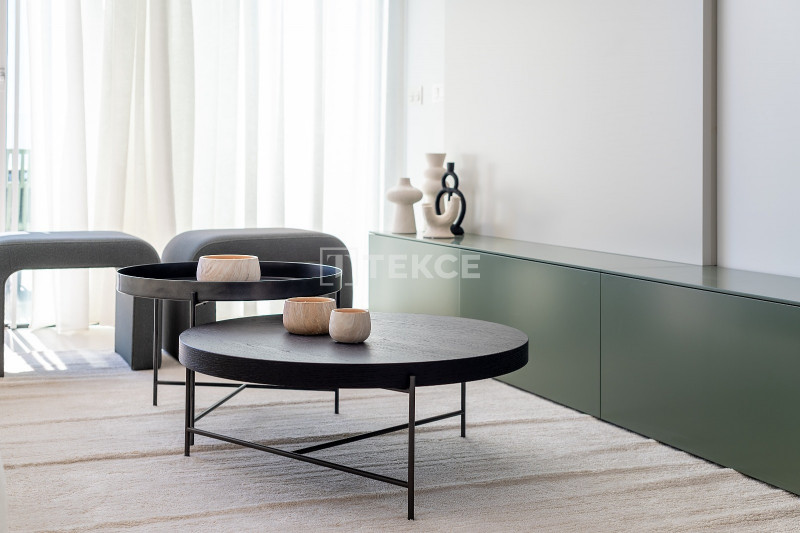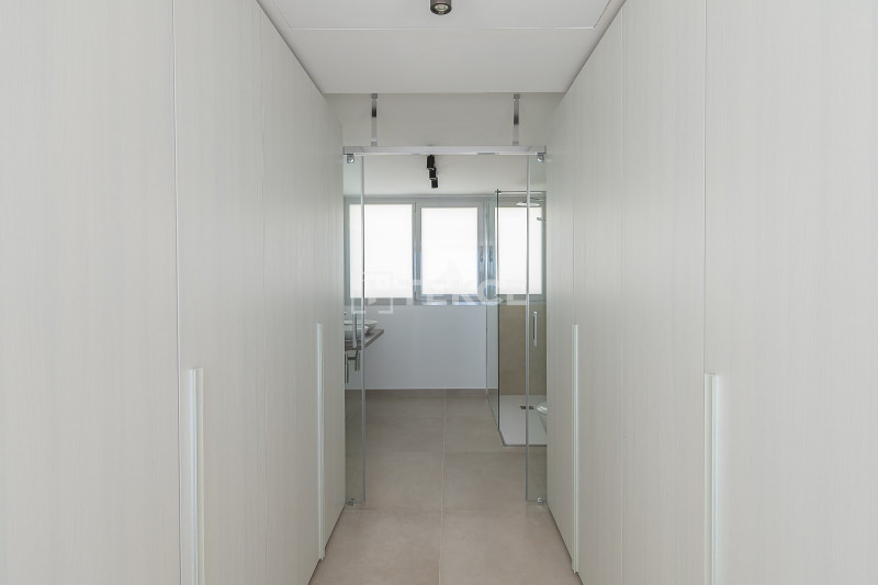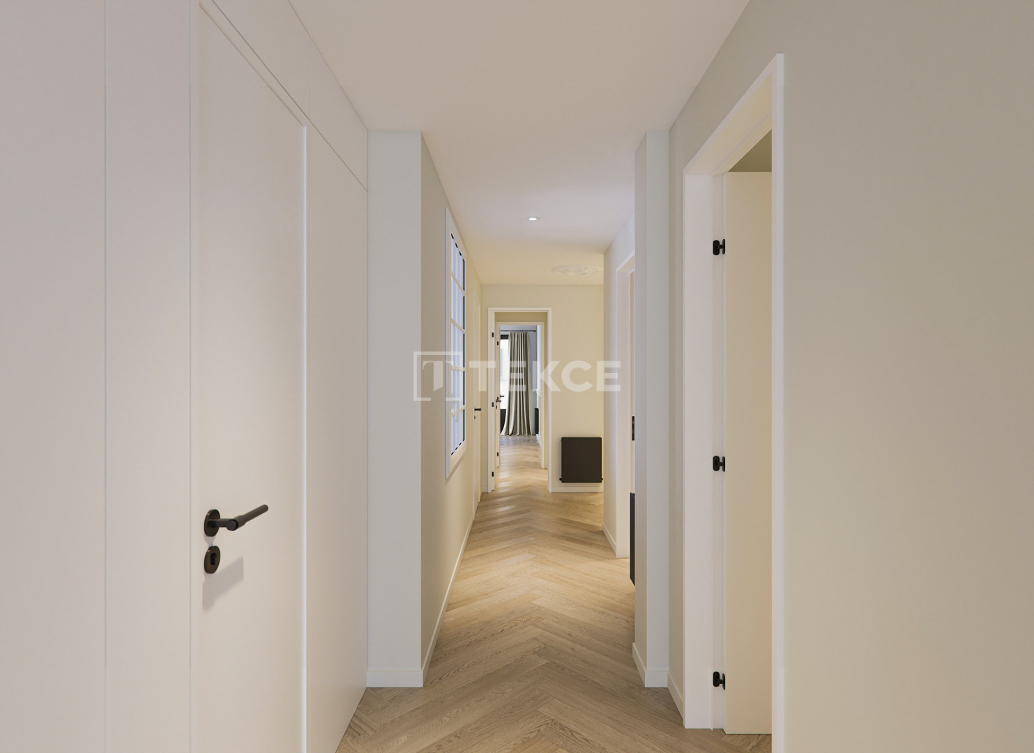 В квартире предусмотрена кухня открытой планировки со встроенной техникой, просторная гостиная, высокие потолки, окна с двойным остеклением, кондиционер и отопление, прачечная и балкон. Интерьер объединяет современный стиль с историческими элементами — мозаикой на полу и каталонскими сводчатыми потолками.