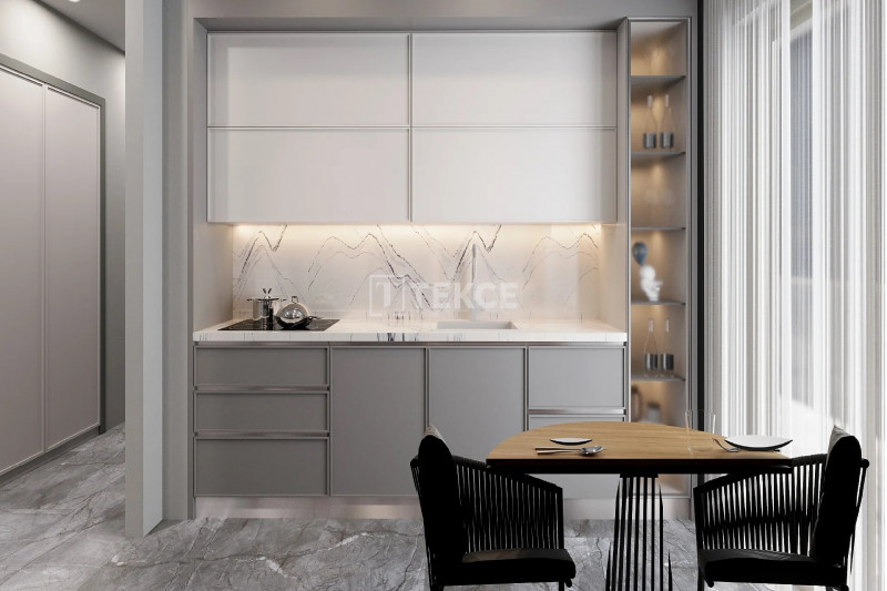 Кухня открытого типа плавно переходит в просторную гостиную и столовую, создавая уютное и удобное пространство. Если вы ищете квартиру в прекрасном районе Хавеа, Испания — этот вариант станет отличным выбором.