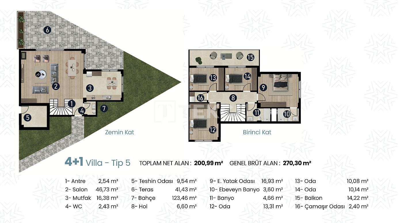 Каждая вилла оснащена лакированными кухонными и ванными шкафами, деревянными и керамическими полами, стальной входной дверью, высококачественной сантехникой и окнами с теплоизоляцией. При мастер-спальнях есть собственные ванные комнаты.