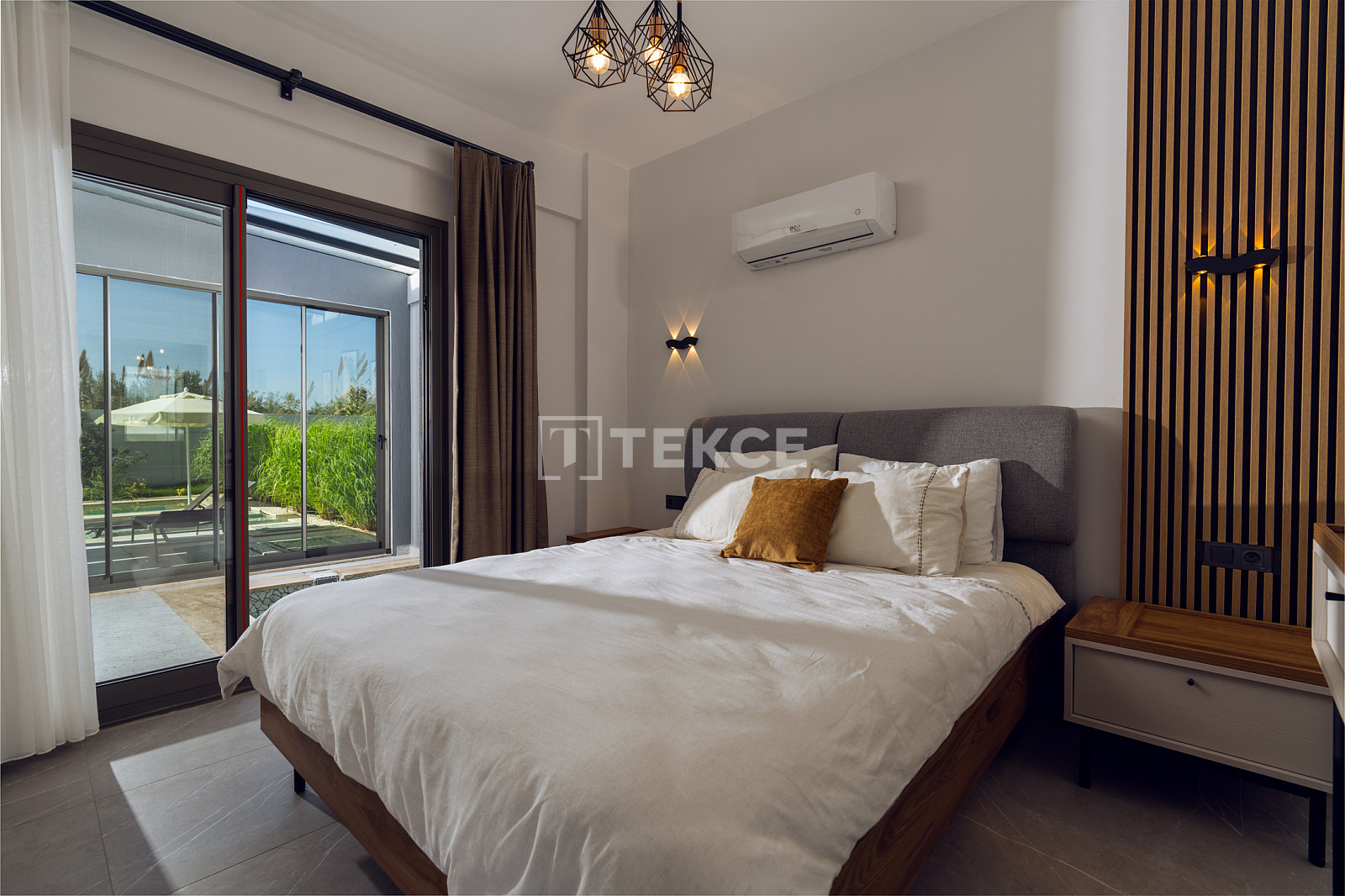 Внутреннее пространство виллы включает 3 спальни и ванные комнаты. К тому же, вилла оснащена системой подогрева пола, кондиционером, жалюзи и интернетом, что обеспечит комфортное проживание в любое время года.