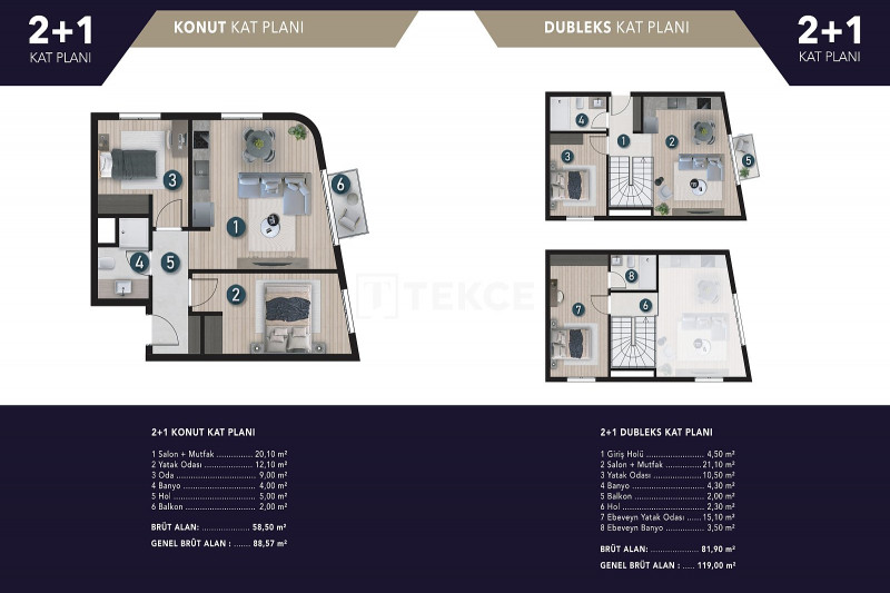 В зависимости от модели квартиры кухни могут иметь открытую или отдельную планировку; в некоторых предусмотрена дополнительная ванная комната при мастер-спальне. Во всех квартирах есть балконы. Роскошные квартиры оснащены внутренней теплоизоляцией, стальной входной дверью, видеодомофоном, встроенной кухонной техникой, полами из керамической плитки и паркета, системой центрального отопления и душевой кабиной.
