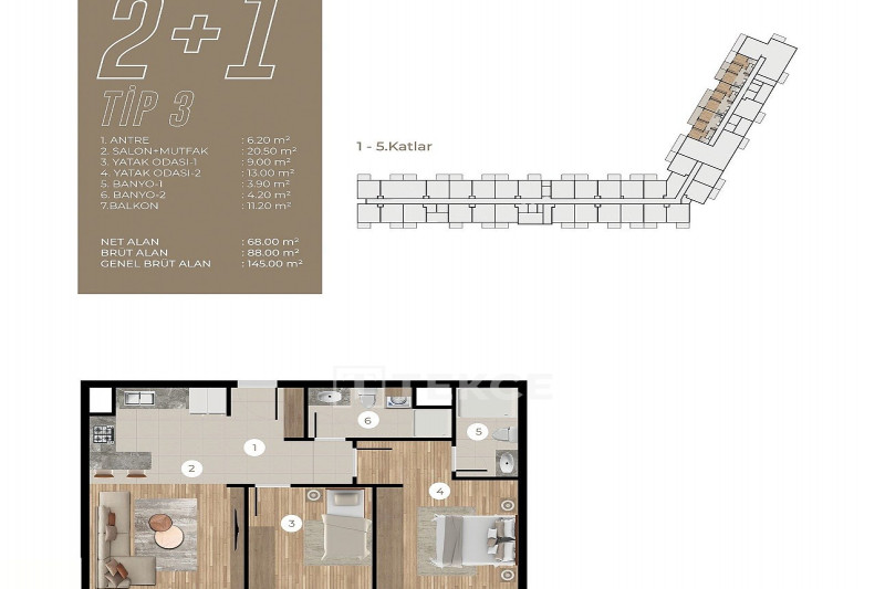 В квартирах есть открытые и отдельные кухни, балконы, ванные комнаты и кладовые. Квартиры также оснащены системой «умный дом», встроенной кухонной техникой, инфраструктурой для высокоскоростного интернета, стальными входными дверями, домофоном, полами из ламината и керамической плитки, душевой кабиной, балконными дверями и окнами ПВХ.