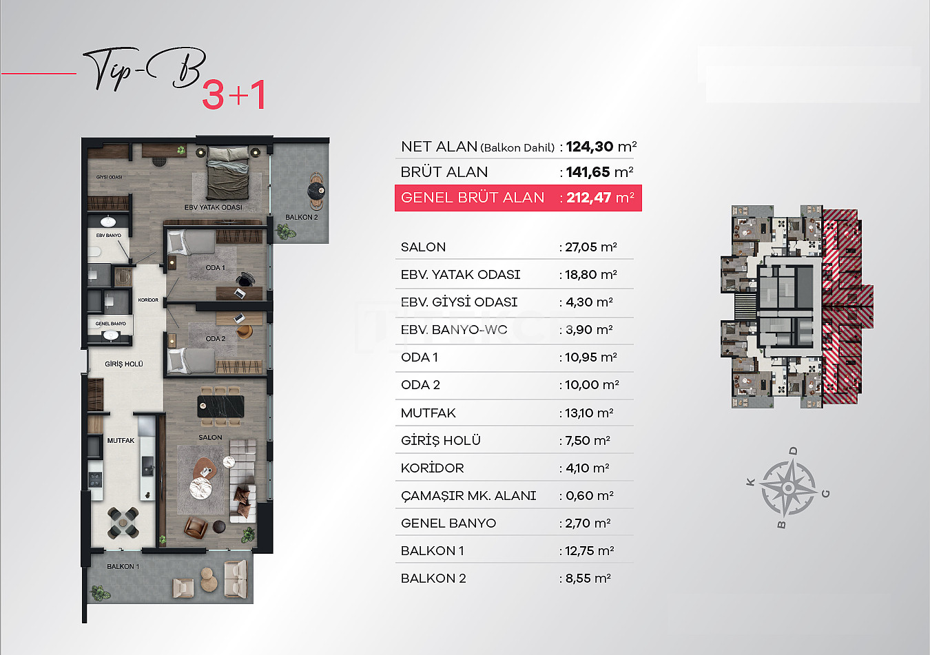 Квартиры отличаются элегантным дизайном и продуманной планировкой. В каждой квартире есть просторная кухня (открытого или отдельного типа), большие балконы с видом на море, ванные комнаты с душевыми кабинами, специально спроектированные шкафы для ванной и кухни, встроенная кухонная техника (варочная поверхность, вытяжка и духовка), система безопасности «умный дом». Квартиры оборудованы алюминиевыми оконными рамами, а также полами из ламиата и керамической плитки.