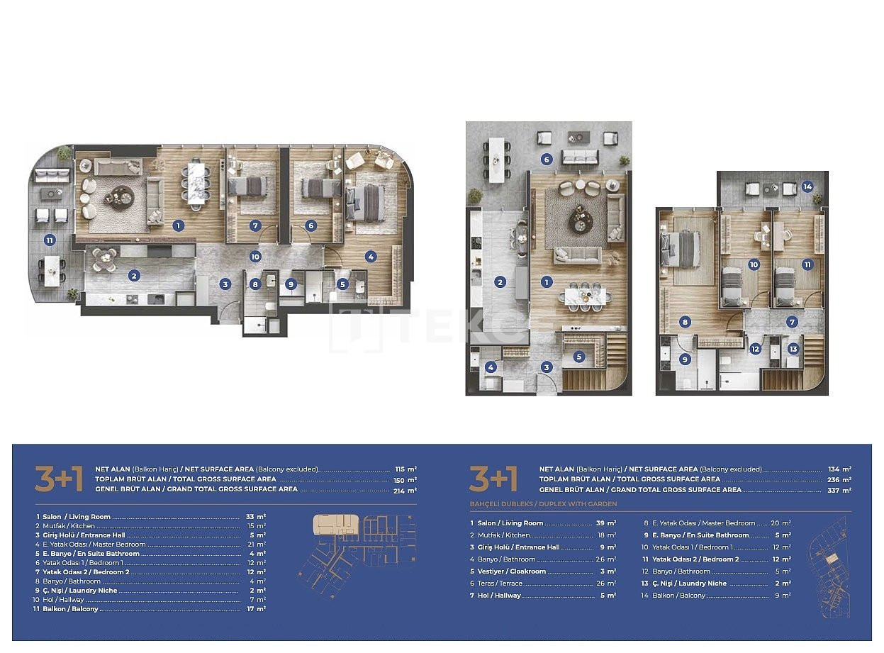 В квартирах имеется кухня отдельной или открытой планировки. Интерьеры включают ванные комнаты, прачечные, балконы и террасы. Квартиры оборудованы встроенной кухонной техникой душевыми кабинами, вешалками, системами подогрева и охлаждения полов, системой «умный дом», спутниковым телевидением, стальными входными дверями, окнами ПВХ, ванными комнатами в стиле «Хилтон».