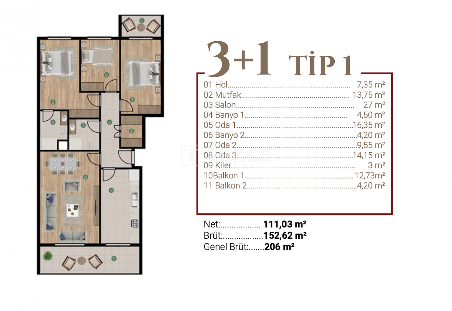 Комплекс семейного типа, построенный на территории площадью 35 000 м², состоит из квартир с 3 и 4 спальнями. В комплексе предусмотрены открытый бассейн, детский бассейн, сауна, декоративный бассейн, фитнес-центр, круглосуточная охрана, детская игровая площадка, крытая парковка, камеры видеонаблюдения, прогулочные дорожки, беседки и частные озелененные территории.