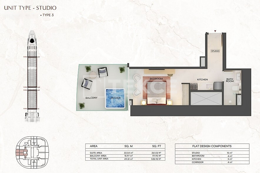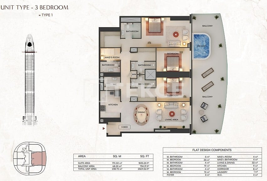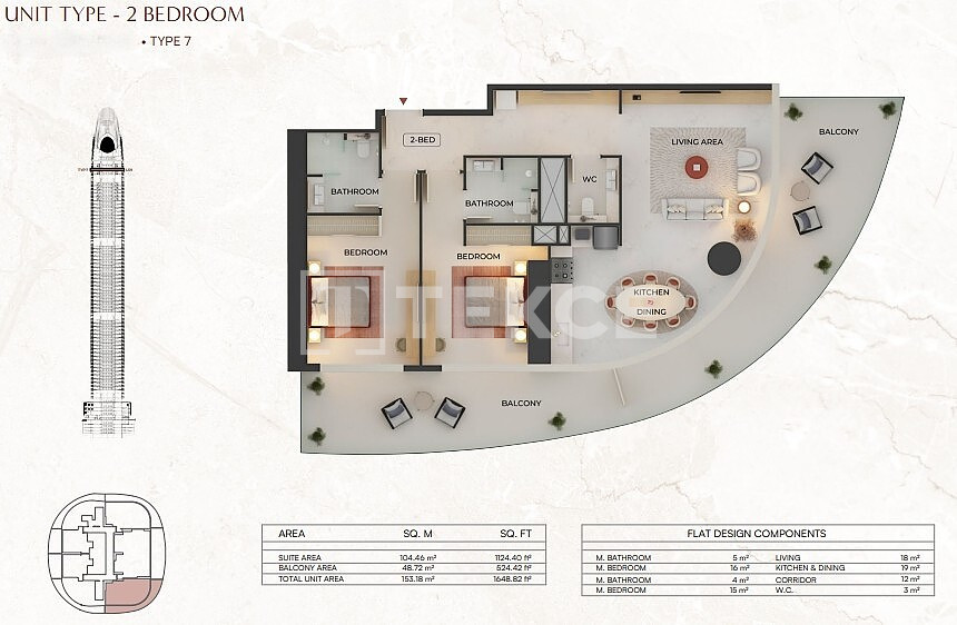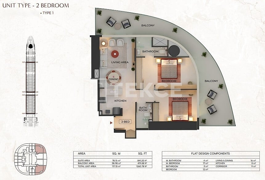 Проект, предложенный TEKCE, включает в себя широкий выбор квартир: от студий до просторных квартир с 3 спальнями. Некоторые эксклюзивные резиденции также оборудованы собственными бассейнами, джакузи и комнатами для прислуги. Комплекс проектирован с учетом удобств курортного типа, включая бассейн-инфинити на крыше, спа-зону, полностью оборудованный тренажерный зал, благоустроенные террасы и сады, беговые и пешеходные дорожки, детские площадки, магазины, рестораны, круглосуточные услуги консьержа и парковщика, а также охраняемую крытую парковку. Жизнь в таком престижном районе — это комфорт, роскошь и долгосрочная ценность.